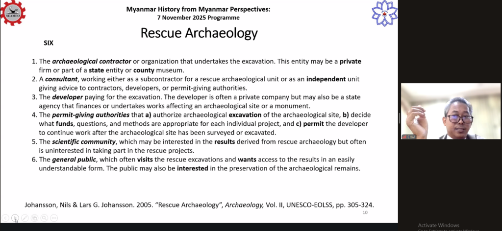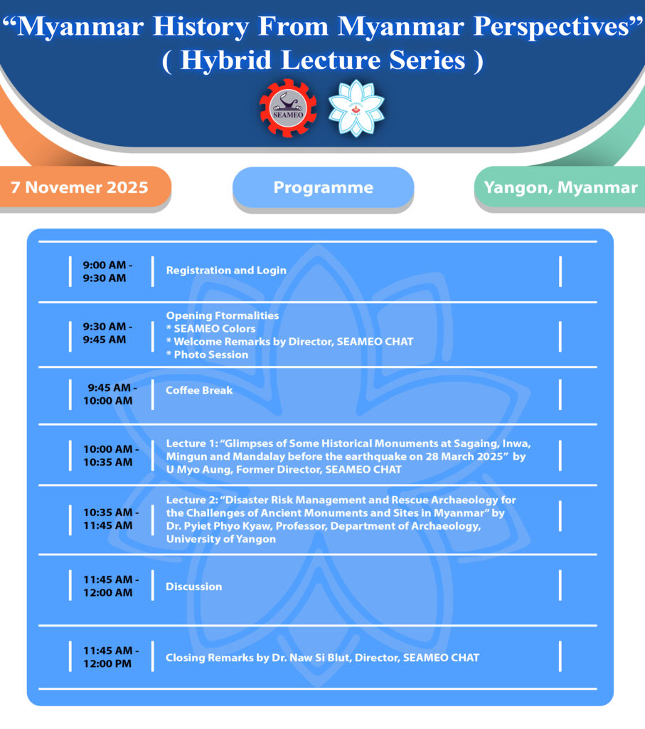 The Hybrid Lecture Series on “Myanmar History from Myanmar Perspectives” was successfully held on 7th November, 2025 which comprised with two papers presented by a Professor from the University of Yangon and the former director of SEAMEO CHAT attended by 28 participants online and 17 participants in person.